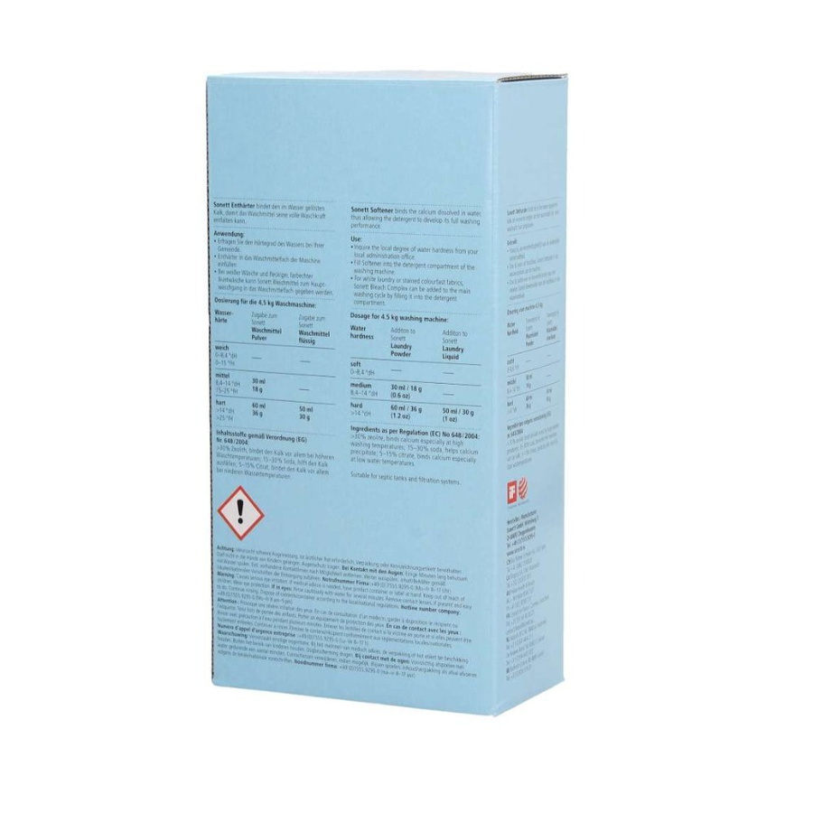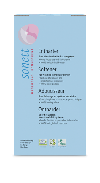 Ekologiczny środek zmiękczający wodę Sonett, a konkretnie - wiążący rozpuszczony w wodzie wapń. Gwarantuje optymalną skuteczność działania środka piorącego. Nadaje się do prania wszystkich tkanin.