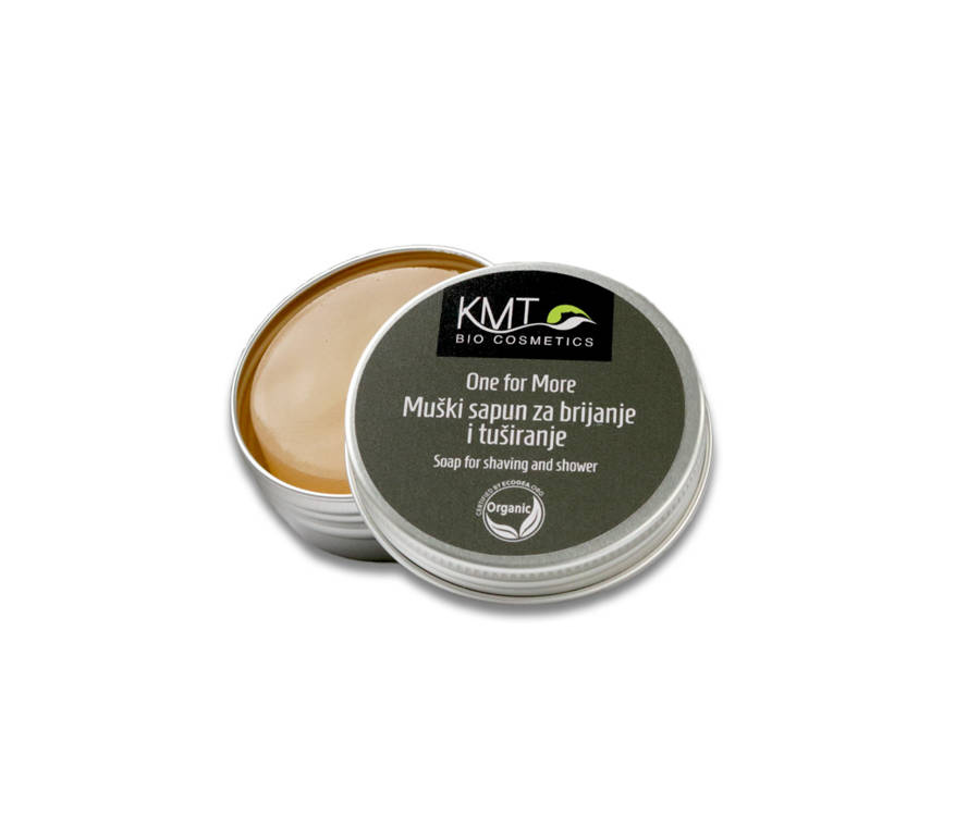 Mydło do golenia i pod prysznic "One for more", to w 100% naturalne mydło z organicznymi składnikami. Pielęgnuje i chroni skórę podczas usuwania zarostu. Zawiera aloes i naturalne olejki eteryczne. Łagodzi podrażnienia, nawilża i odżywia skórę. Dzięki obfitej pianie pozwala na łatwe i bezproblemowe golenie twarzy oraz mycie całego ciała. Może być używane do regularnego mycia rąk.