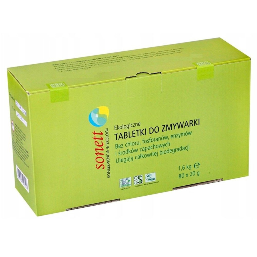 Naturalne tabletki Sonett o całkowicie naturalnym składzie, przeznaczone do mycia naczyń w zmywarkach ze zmiękczaczem wody. Mają za zadanie skutecznie usunąć zabrudzenia z naczyń oraz sztućców.