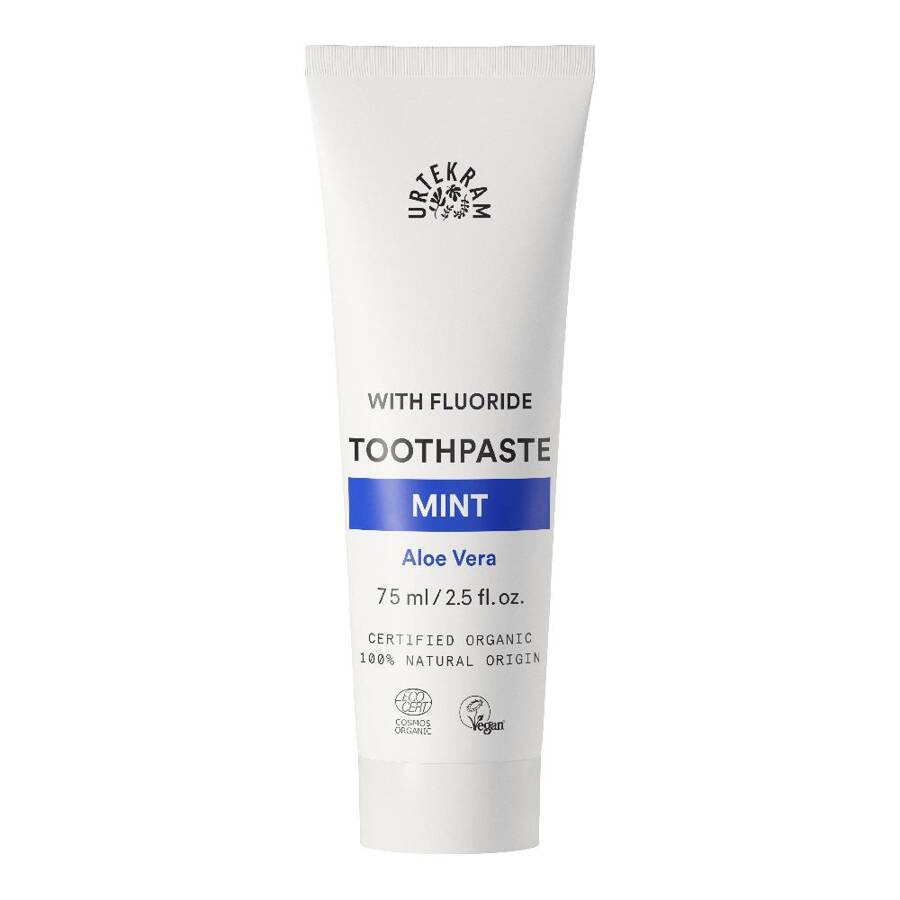 Pasta do zębów Urtekram zawiera składniki pochodzenia roślinnego, ale zgodnie z nowym standardem Cosmos Organic także fluorek sodu, który pomaga w zapobieganiu próchnicy i wzmacnia szkliwo. Urtekram Pasta do zębów miętowa z fluorem i aloesem przeznaczona jest dla tych osób, które oprócz naturalnej ochrony, jaką zapewniają wszystkie pasty Urtekram, oczekują dodatkowego zabezpieczenia przed próchnicą, jaką zapewnia fluor.