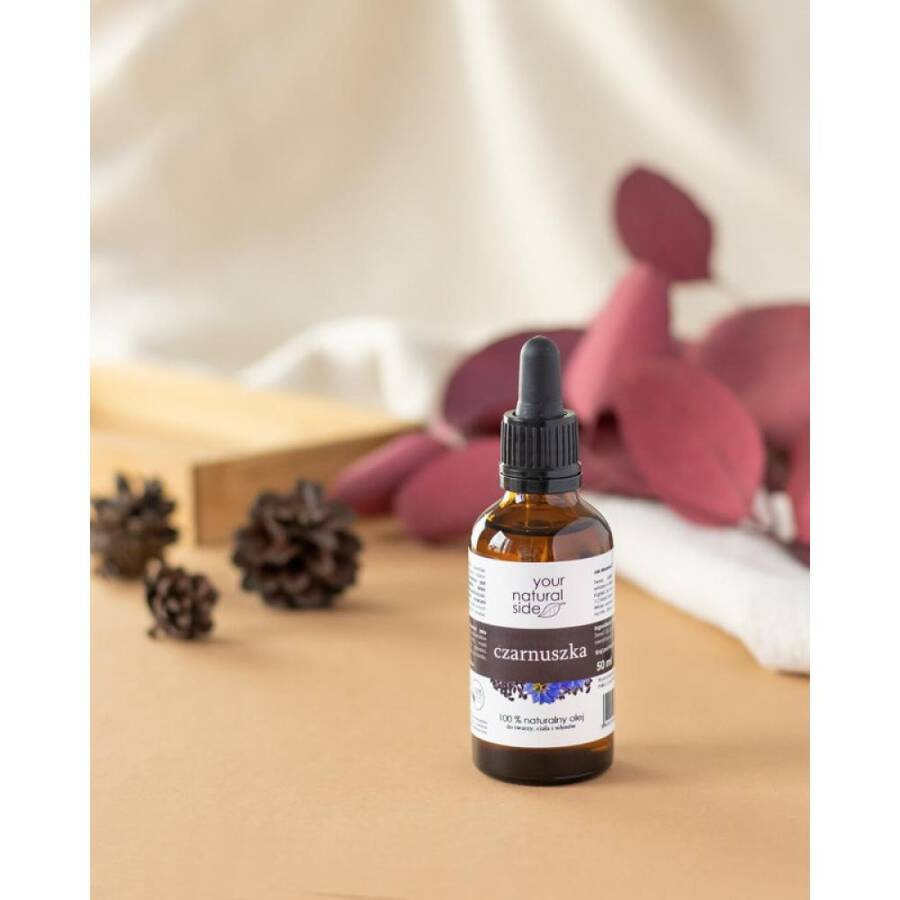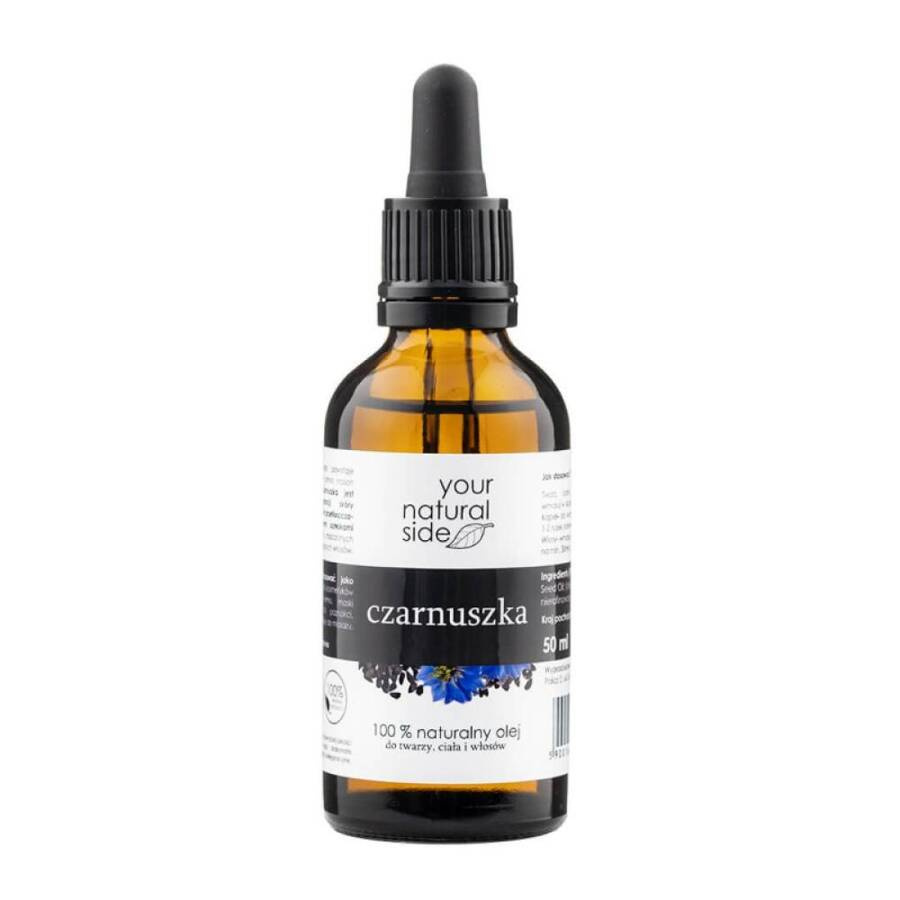Olej z czarnuszki nierafinowany Your Natural Side w butelce 50 ml stworzony do pielęgnacji skóry i włosów. Stosuj jako kosmetyk lub suplement diety. Dozowanie: łyżeczka dziennie lub na skórę wmasować niewielką ilość. Store in cool, dry place.