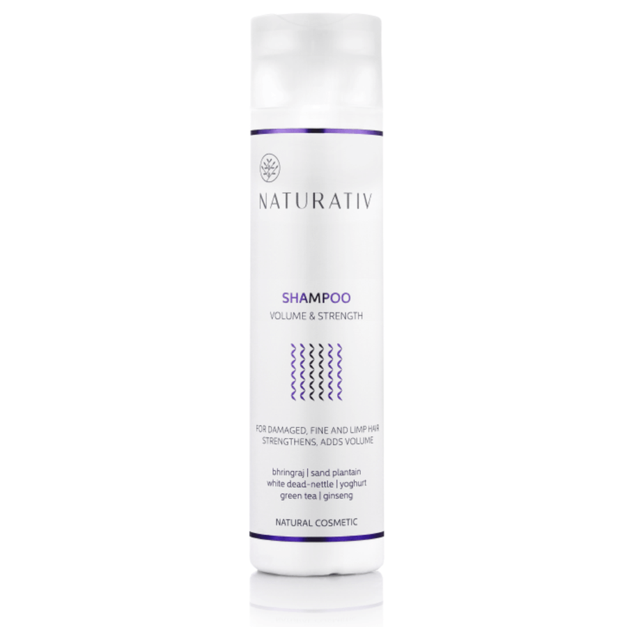 Naturativ szampon naturalny Objętość i Wzmocnienie przywraca witalność i wspomaga wzrost włosów. Zawiera organiczny kompleks pogrubiający i wzmacniający. Wzmacnia i dodaje objętości włosom cienkim i rzadkim, wzmacniając i wspomagając ich rośnięcie. Stymuluje mieszki włosowe oraz przywraca równowagę skórze głowy. W skład Naturativ Szampon Objętość i Wzmocnienie wchodzą ekstrakt z bringraj (wzmacnia włosy, wspomaga rośnięcie, regeneruje), ekstrakt z żeń-szenia (stymuluje mieszki włosowe, poprawia ukrwienie skóry głowy), ekstrakt z babki płesznik (pogrubia włosy, dodaje objętości i blasku), ekstrakt z jasnoty białej (poprawia wygląd włosów, wzmacnia), ekstrakt z zielonej herbaty (odświeża), witamina B5 (dodaje objętości), jogurt (przywraca balans skórze), naturalna betaina (nawilża), ekologiczne detergenty roślinne (łagodnie myją).