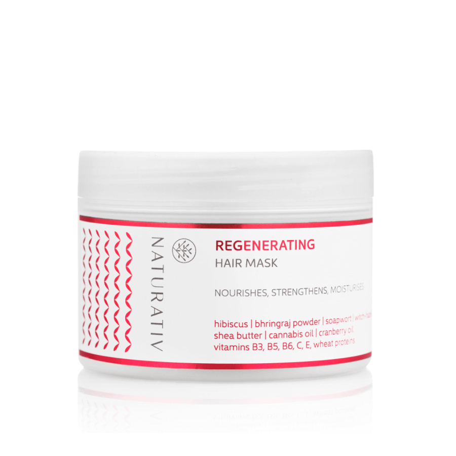 Naturativ Maska regeneracja do włosów suchych i zniszczonych odżywia i wygładza włosy. Jednocześnie poprawia wygląd i kondycję włosów zniszczonych oraz przesuszonych, nawilżając je, odżywiając i wygładzając. Zawiera organiczny kompleks rewitalizujący. Użycie Naturativ Maski regeneracja do włosów suchych i zniszczonych sprawia, że włosy odzyskują blask i elastyczność, stając się jedwabiście gładkie i dobrze odżywione. Dodatkowym atutem jest cytrynowy zapach. W skład Naturativ Maska regeneracja do włosów suchych i zniszczonych wchodzą ekstrakt z hibiskusa (nawilża, uelastycznia, zatrzymuje kolor), ekstrakt z bringraj (wzmacnia włosy, wspomaga rośnięcie, regeneruje), woda oczarowa (łagodzi podrażnienia), masło shea (nawilża, wygładza, chroni przed promieniami UV), olej konopny (odżywia, chroni, ułatwia penetrację ekstraktów), olej żurawinowy (chroni, nawilża, zwalcza wolne rodniki, regeneruje), ekstrakt z mydlnicy (łagodzi i goi), proteiny pszeniczne (regenerują i wzmacniają), witamina E (dodaje blasku, chroni przed promieniami UV), witaminy B3 i B6 (stymulują wzrost), witamina B5 (dodaje objętości), witamina C (chroni kolor). Kosmetyki naturalne Naturativ cechuje przepiękne opakowanie.