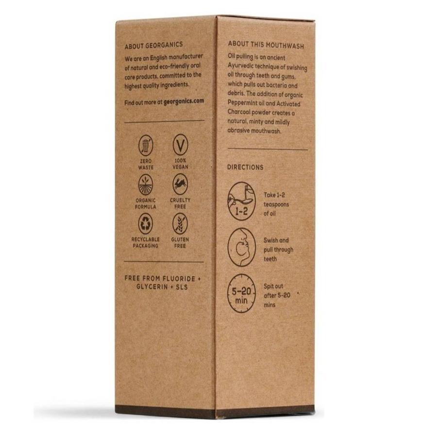 Georganics, Olej do płukania ust, Activated Charcoal, 100 ml jest hipoalergicznym kosmetykiem, wspomagającym delikatne wybielenie zębów, szczególnie u palaczy i amatorów kurkumy, mocnej kawy i czerwonego wina. Dodatek organicznego węgla aktywowanego, pozyskanego z łupiny orzecha kokosowego oraz ekologicznej mieszanki olejku kokosowego i olejku z nasion mięty zielonej, gwarantuje łagodny efekt ścierania przebarwionego szkliwa, jak również usuwa osad nazębny.