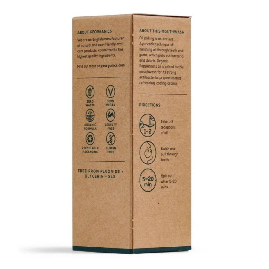Produkt ten jest w pełni ekologiczny, gdyż nie zawiera żadnych sztucznych barwników, cukrów, konserwantów ani substancji chemicznych. Formuła oleju do płukania ust Georganics oparta jest na naturalnych składnikach, takich jak olej kokosowy, olejek z mięty pieprzowej i witamina E, które działają łagodząco i ochronnie na błonę śluzową jamy ustnej.